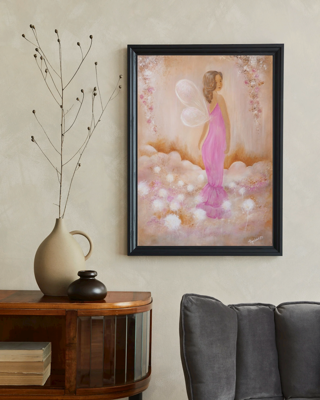 Hetken taikaa -juliste vangitsee herkän ja mystisen hetken, jossa pinkkiasuinen enkeli katsoo olkansa yli eteenpäin, katseessaan lempeää pohdintaa ja salaperäisyyttä. Julisteen ruskeat sävyt ja hennot valkoiset hahtuvat luovat lämpimän ja unenomaisen tunnelman, joka kutsuu pysähtymään ja nauttimaan hetkestä. Tämä kaunis juliste tuo tilaan rauhaa ja taianomaisuutta ja on täydellinen lisä tuomaan pehmeyttä ja harmoniaa kotiisi tai työtilaan.