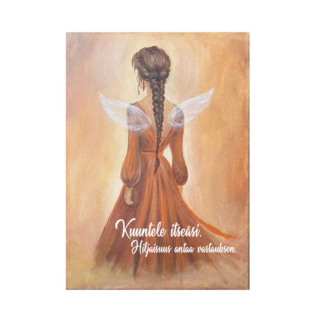 Postikortti, jossa teksti "Kuuntele itseäsi. Hiljaisuus antaa vastauksen.” Kuvassa enkelitaulu nimeltään Hiljaisuus puhuu lempeästi.