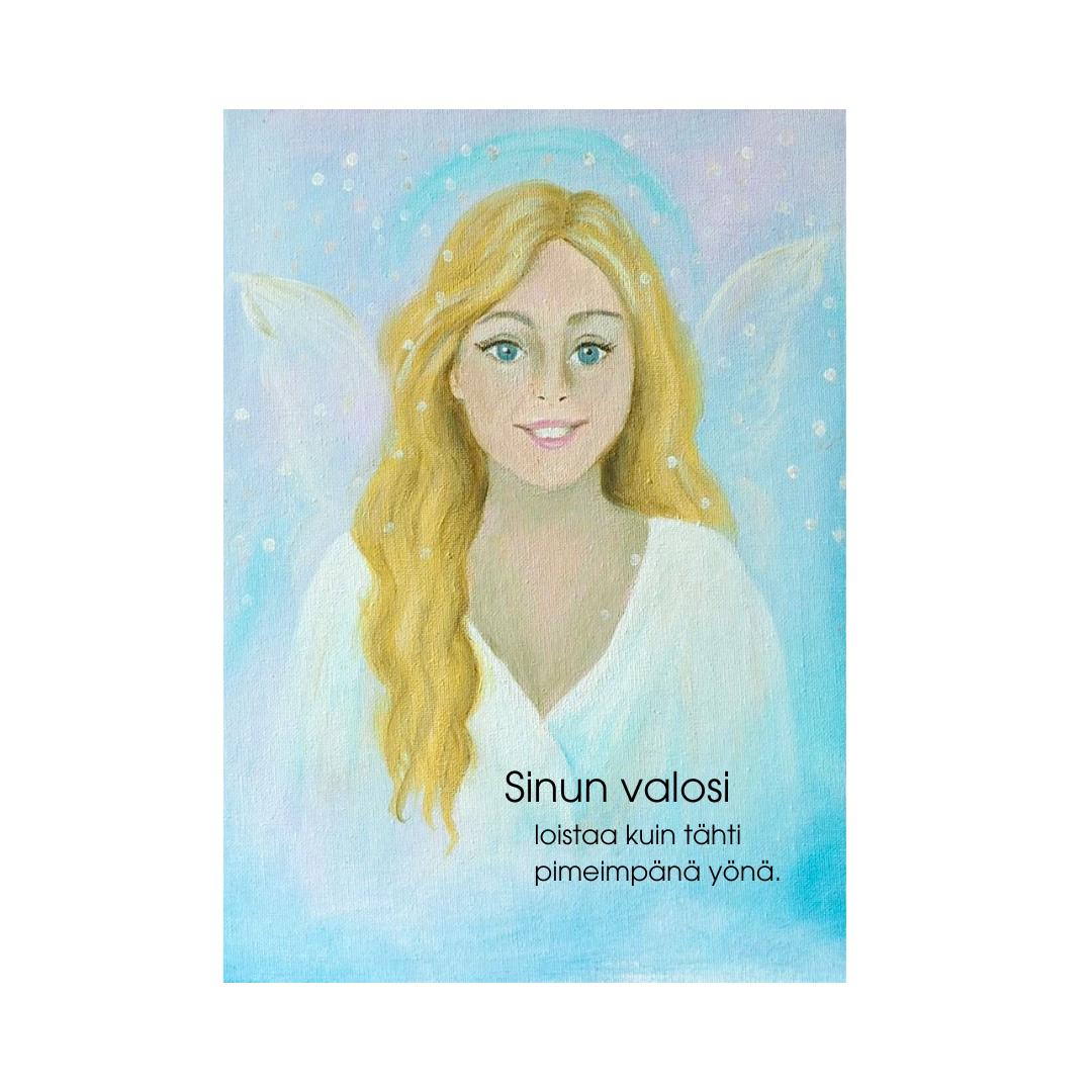 Postikortti, jossa teksti "Sinun valosi loistaa kuin tähti pimeimpänä yönä.” Kuvassa enkelitaulu nimeltään Hymyillen.