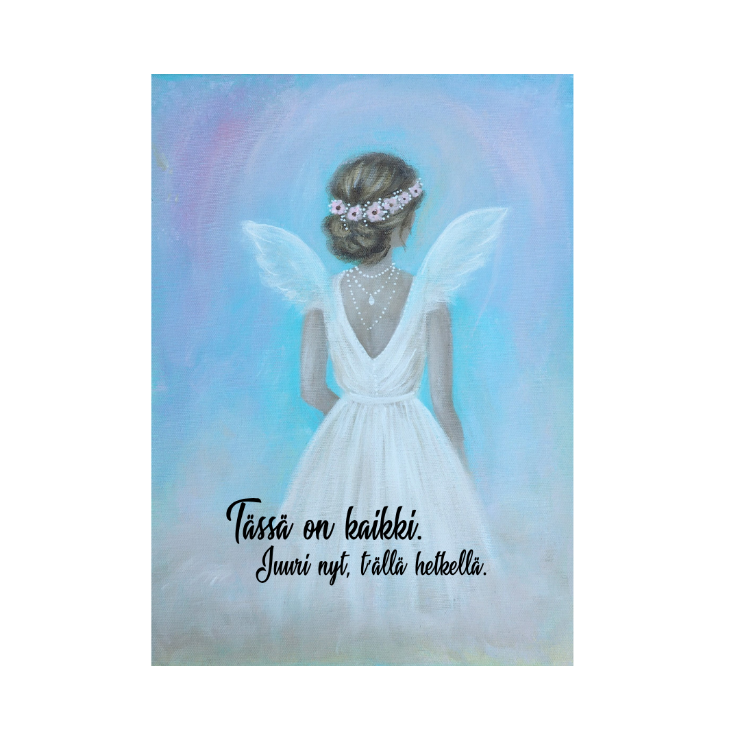 Postikortti, jossa teksti "Tässä on kaikki. Juuri nyt, tällä hetkellä.” Kuvassa enkelitaulu nimeltään Keväisen valon lupaus.
