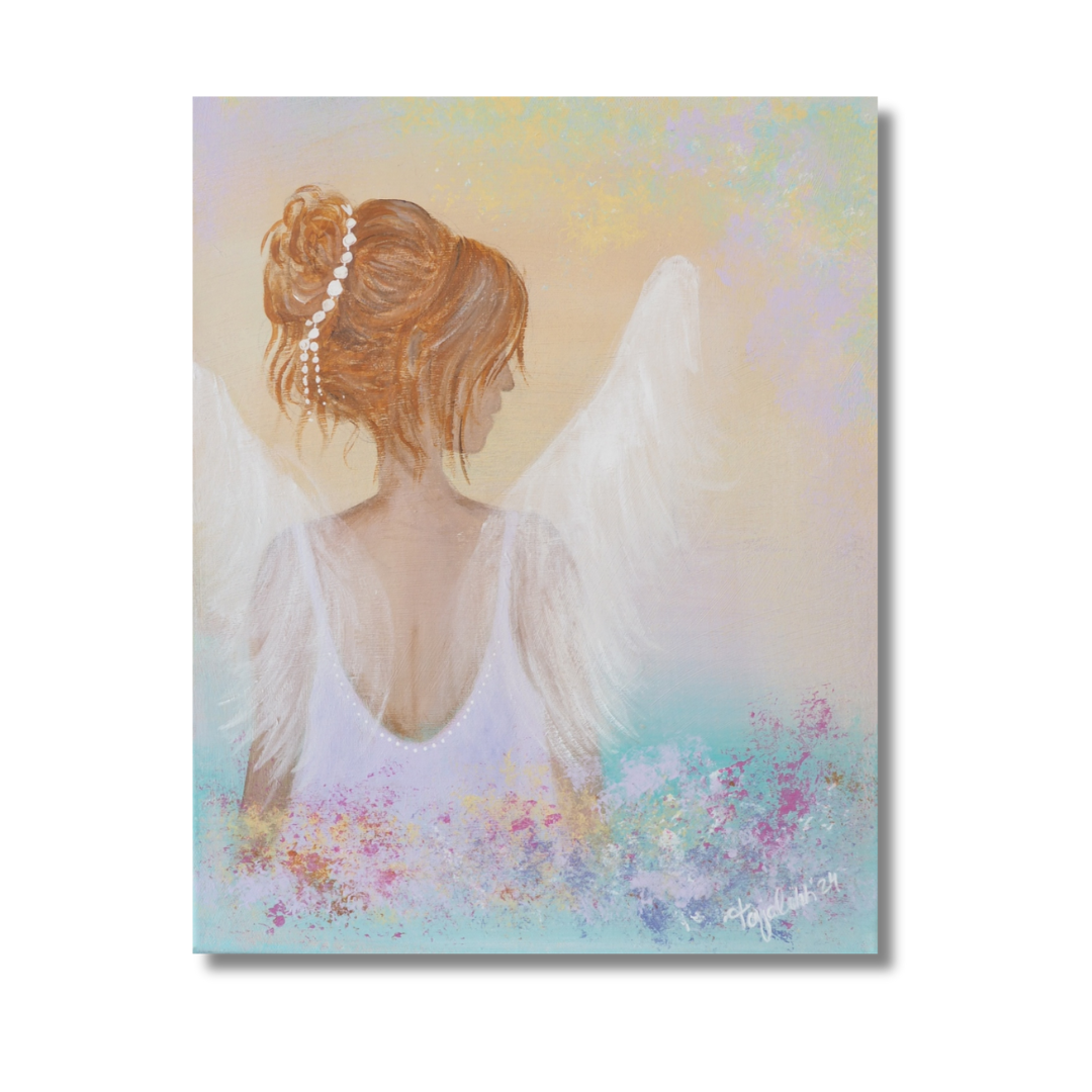 Herkkä ja rauhoittava taulu, jossa enkeli katselee lempeästi sivulleen kukkien keskellä. Utuiset aamun sävyt tuovat teokseen rauhallisen ja unenomaisen tunnelman, kuin hetken ennen päivän ensimmäisiä auringonsäteitä. Tämä taulu kutsuu hiljentymään ja nauttimaan hetkestä – vielä ei ole kiire, aamuun on vielä aikaa