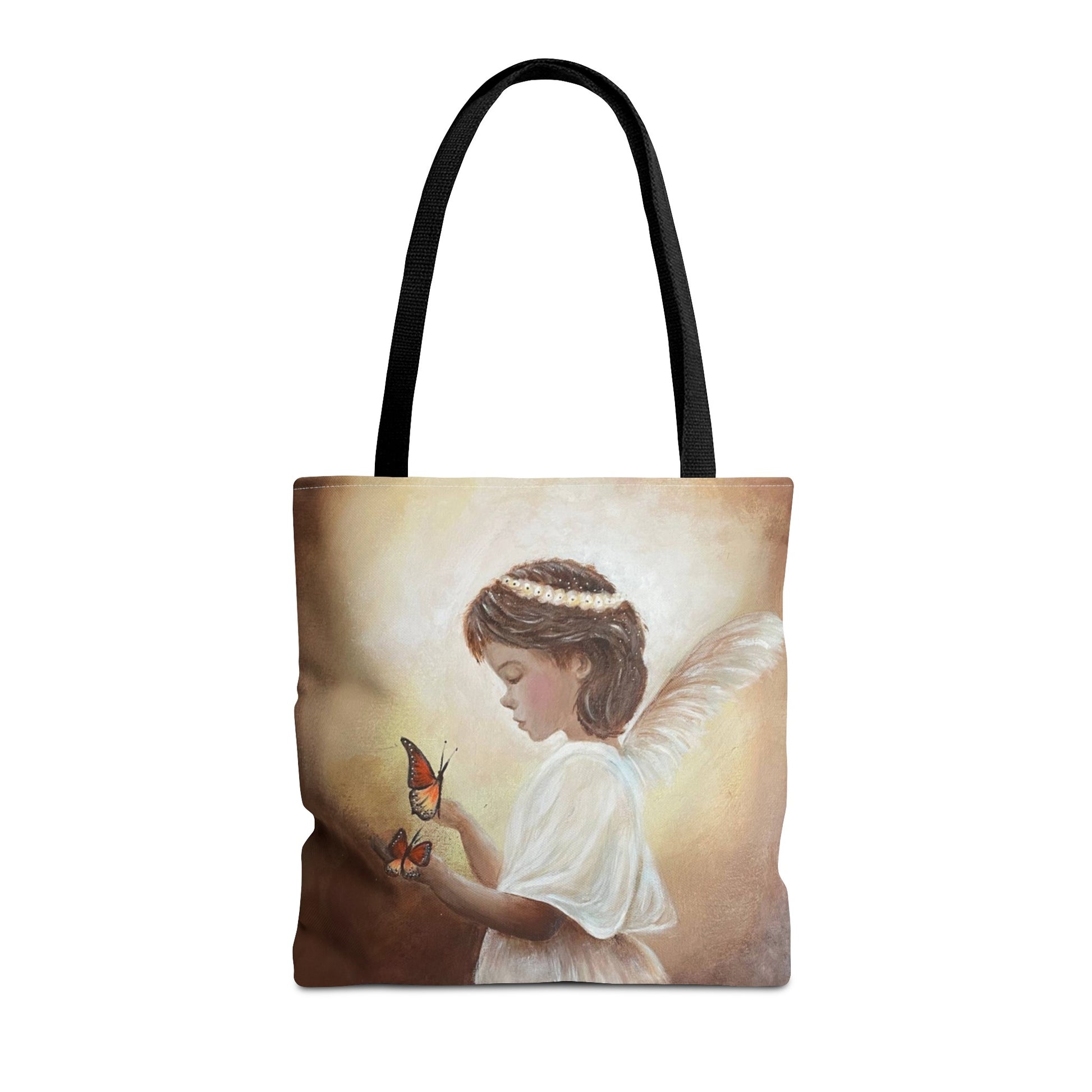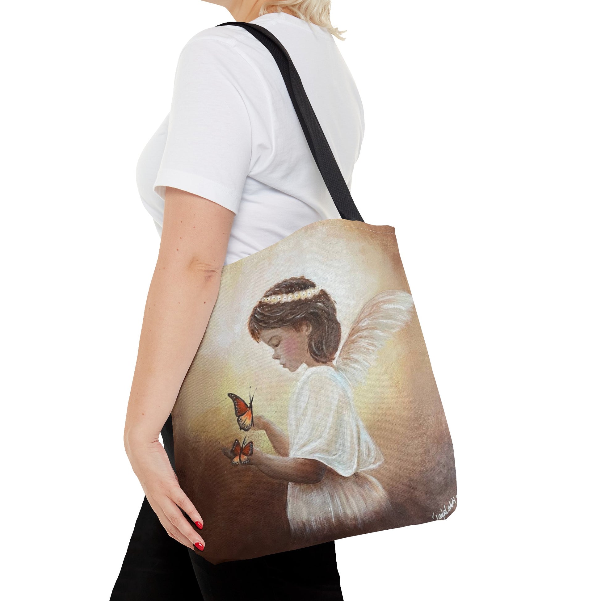 Monikäyttöinen enkeliaiheinen kangaskassi, jossa kaunis kuva Tänään on hyvä päivä -nimisestä taulusta.