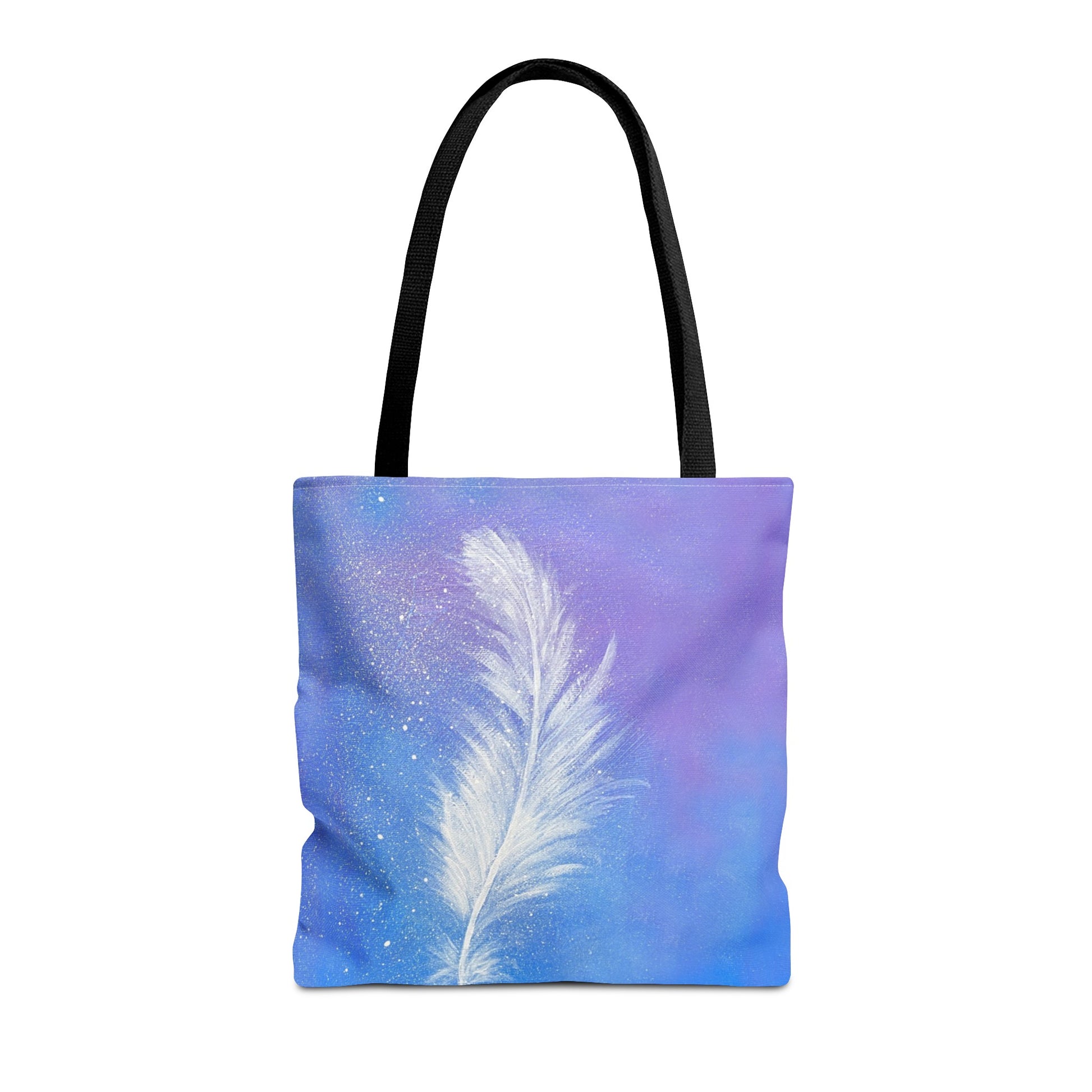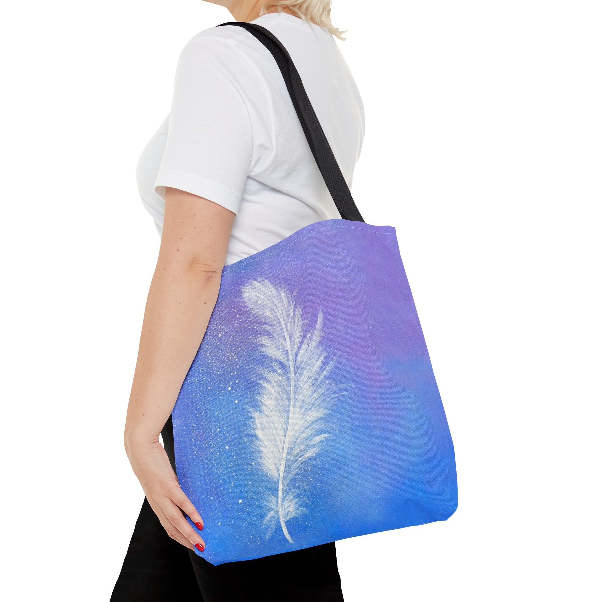 Monikäyttöinen valkoinen kangaskassi, jossa kuva herkkä sulkakuva.