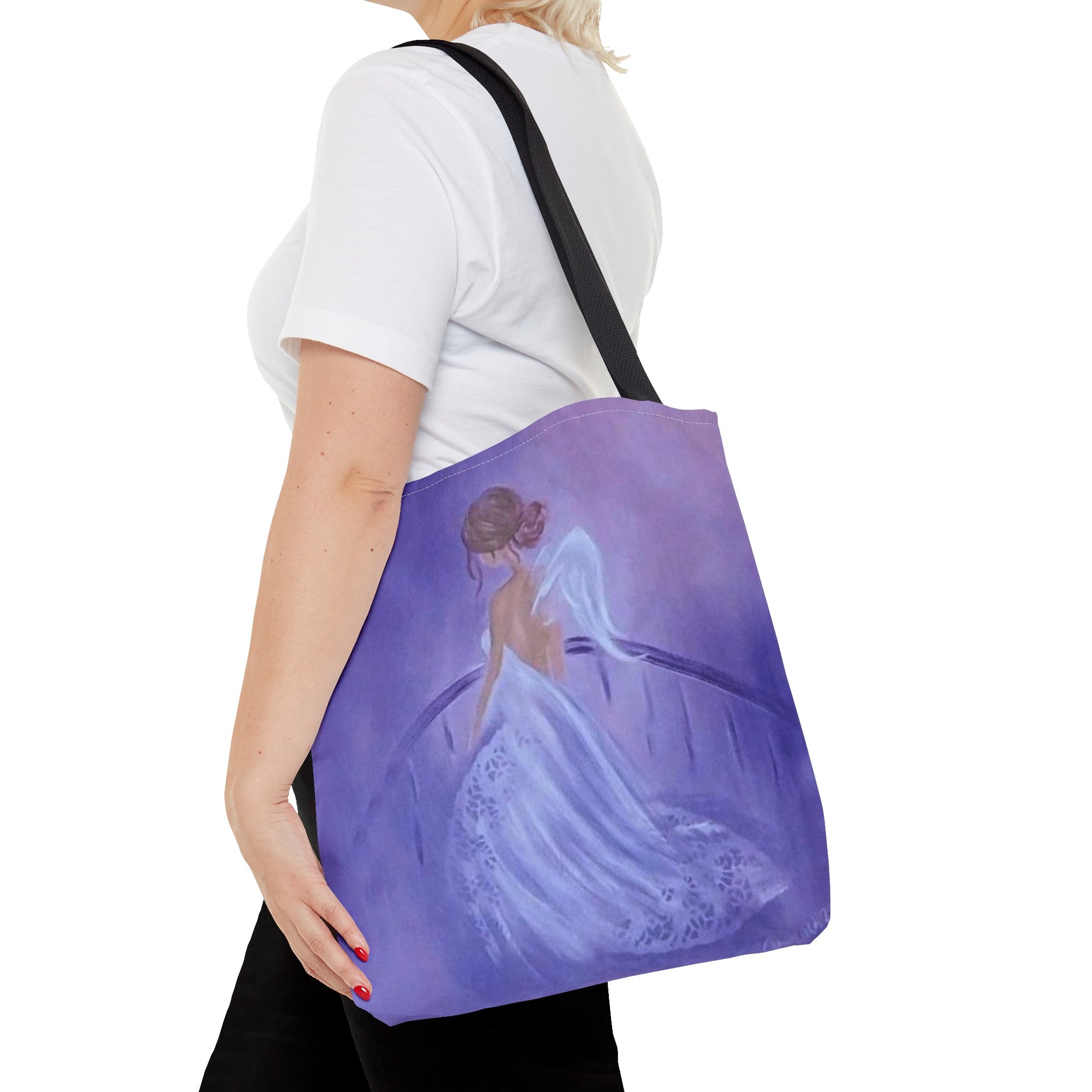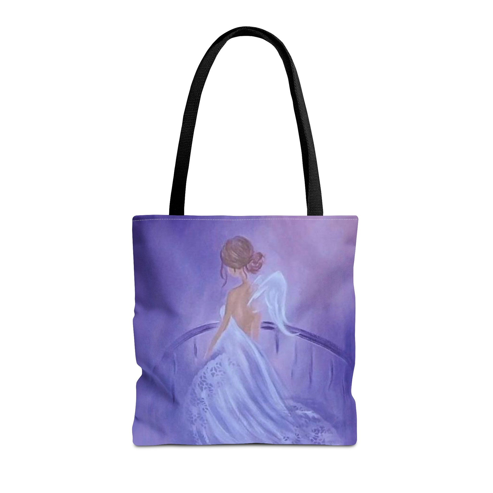 Monikäyttöinen enkeliaiheinen kangaskassi, jossa kuva Sumujen sillalla -taulusta.