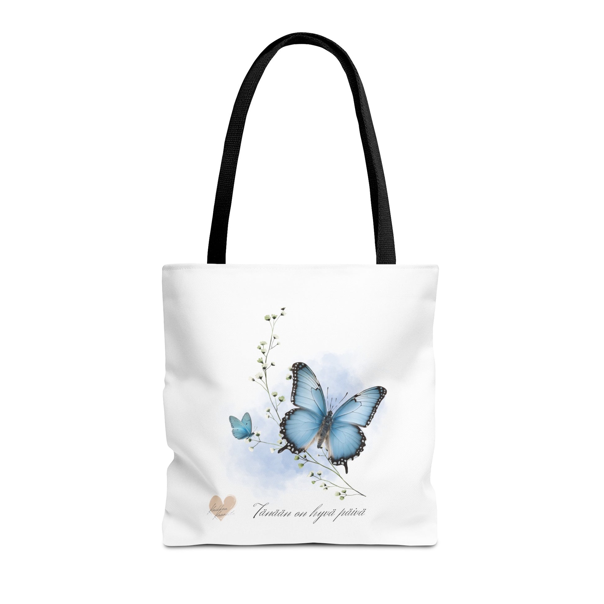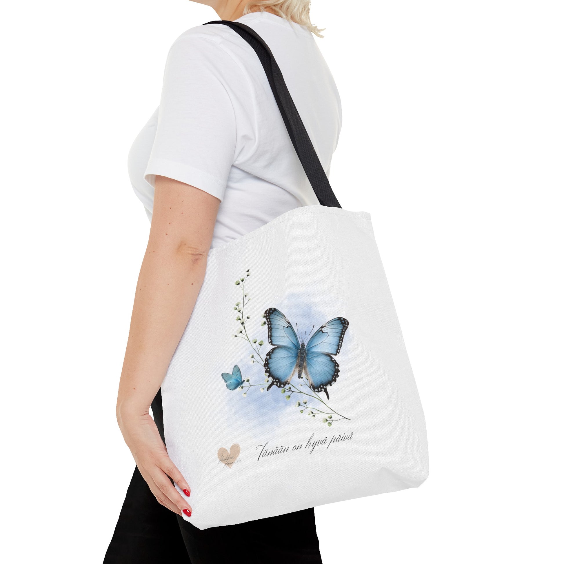 Kaunis valkoinen kesäkassi sinisellä perhoskuvalla. Lisäksi teksti "Tänään on hyvä päivä".
