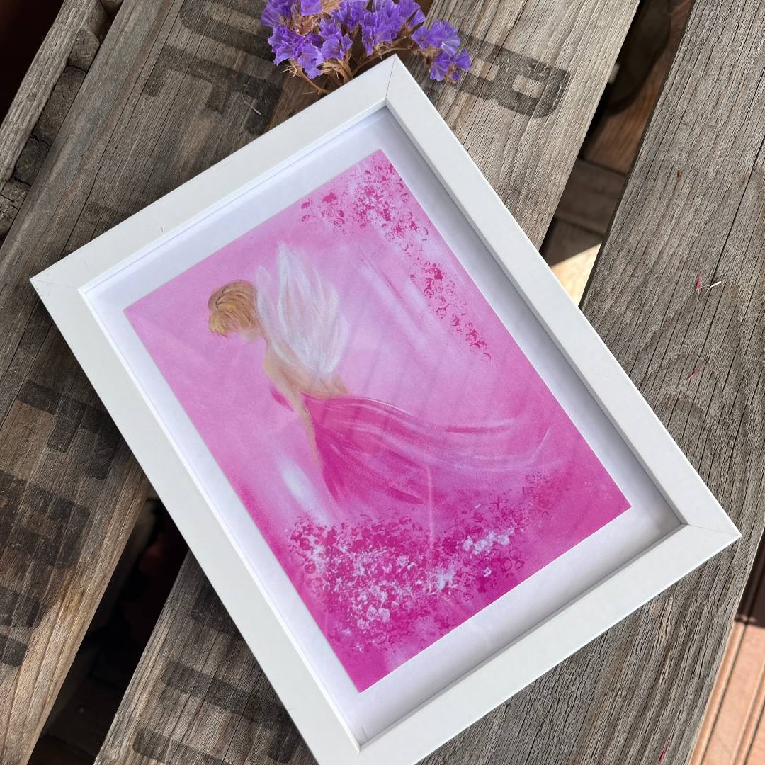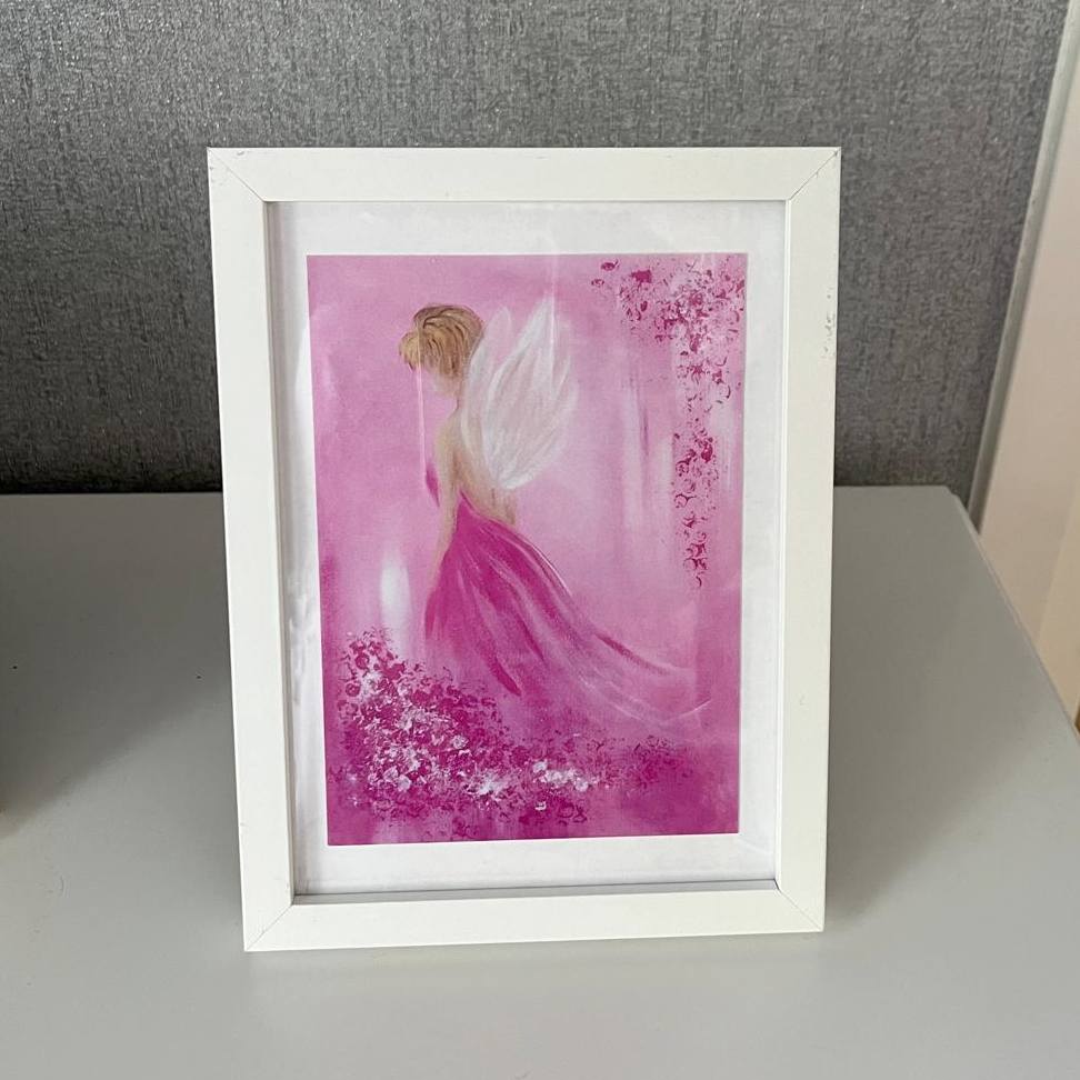 Postikortista saa mukavan pikkutaulun, kun laittaa sen kehyksiin. Onnenlähde-kortti on saanut tässä valkoiset kehykset. Kuvan päällä on kirkas ja kova muovi. Pikkutaulu on valmis seinällesi tai vaikkapa yöpöydällesi.